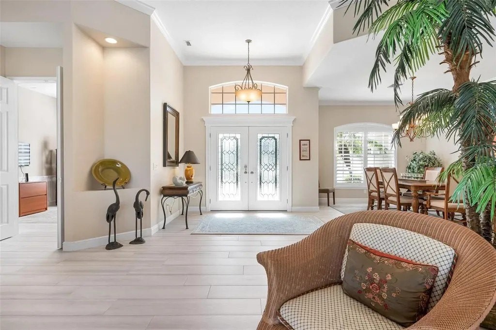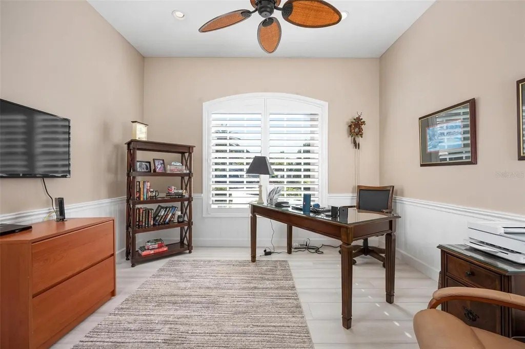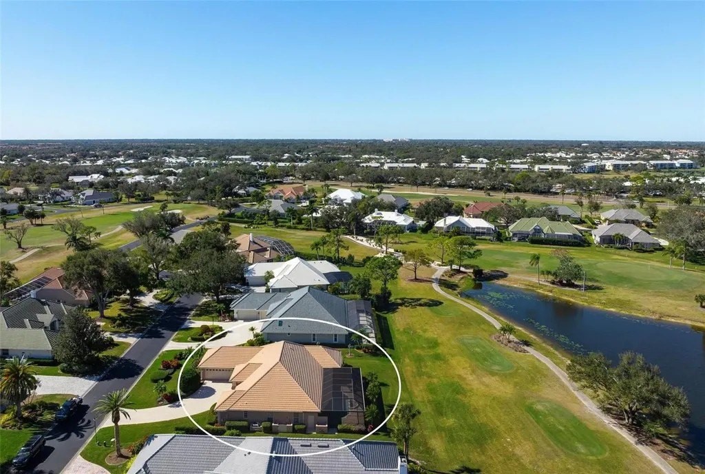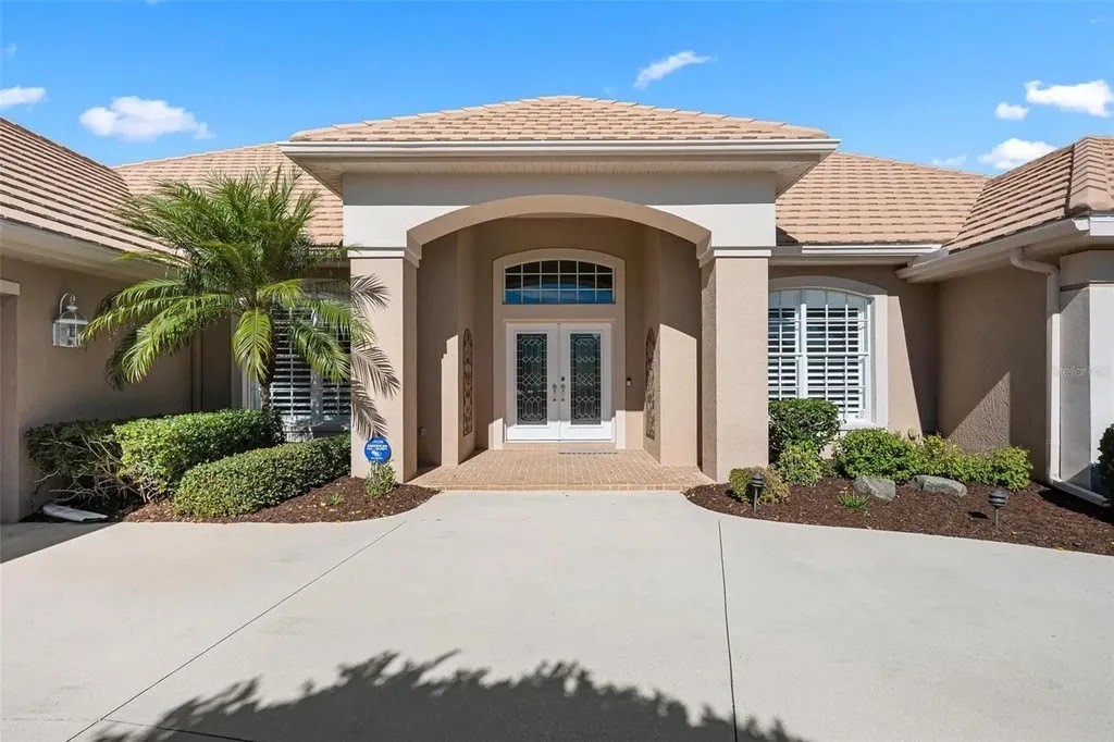 Welcome home to The Reserve at The Plantation, a premier gated enclave where pride of ownership, timeless elegance, and resort-style living come together. This visibly striking residence offers exceptional curb appeal and has been meticulously cared for and thoughtfully updated throughout. Situated on a choice quarter-plus-acre lot, the home enjoys panoramic golf and lake views overlooking the Panther 7th and 8th fairways, all tucked away on a quiet, dead-end street-perfect for morning strolls with neighbors and furry friends alike. Designed with a desirable split-bedroom floor plan, the home features three spacious bedrooms and three baths, each offering generous closet space. The primary suite is a true retreat, complete with walk-in closets and a beautifully updated spa-inspired bath featuring custom cabinetry, quartz countertops, a spacious walk-in shower, and a luxurious soaking tub. Entertain with ease in the formal living and dining rooms, highlighted by crown molding, stylish plank tile flooring and pocketing sliding glass doors that open seamlessly to the expansive lanai. Outside, a stunning heated pool and spa are framed by a clear-view screen cage, offering breathtaking, unobstructed vistas of rolling fairways, tranquil lakes, and Florida's abundant wildlife. The updated kitchen and family room truly form the heart of the home. Custom BROOKHAVEN cabinetry, quartz countertops, walls of storage, a pantry, and a dry bar with wine refrigerator and glass-front cabinets create both beauty and function. Walls of glass provide front-row seats to sweeping golf and water views, making everyday living feel extraordinary. A private office with closet, finished with plank tile and peaceful views, offers flexible space for work or guests. The spacious laundry room is equally impressive, featuring wall cabinetry, a laundry tub, washer and dryer, and a full-size second refrigerator. The tropical landscaped yard and long winding driveway lead to an oversized, side-load two-car garage with room for golf cart parking, epoxy flooring, abundant storage, and attic access-immaculate and thoughtfully designed. Located within The Plantation Golf and Country Club, golf and social memberships are available but not mandatory, allowing you to enjoy the lifestyle at your own pace. Best of all, there are no CDD fees. Centrally positioned just 15 minutes from pristine Gulf beaches, historic Downtown Venice, the Legacy Trail, Downtown Wellen Park, and a wide array of shopping and dining, this home delivers the perfect balance of tranquility and convenience. A truly fabulous home in an exceptional location-where pride of ownership shines throughout. A full list of upgrades is available.