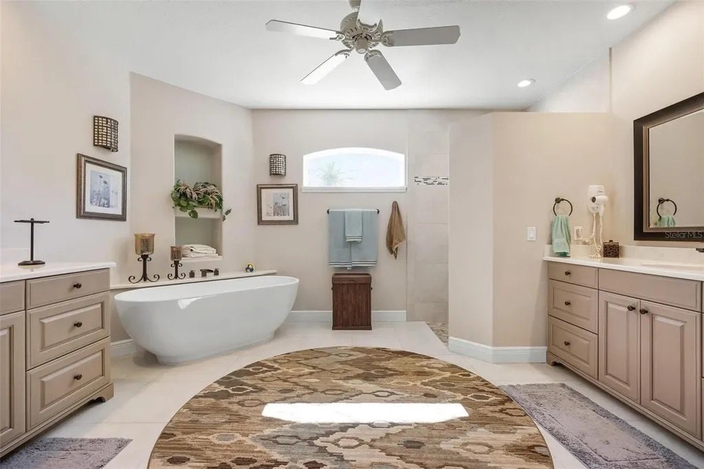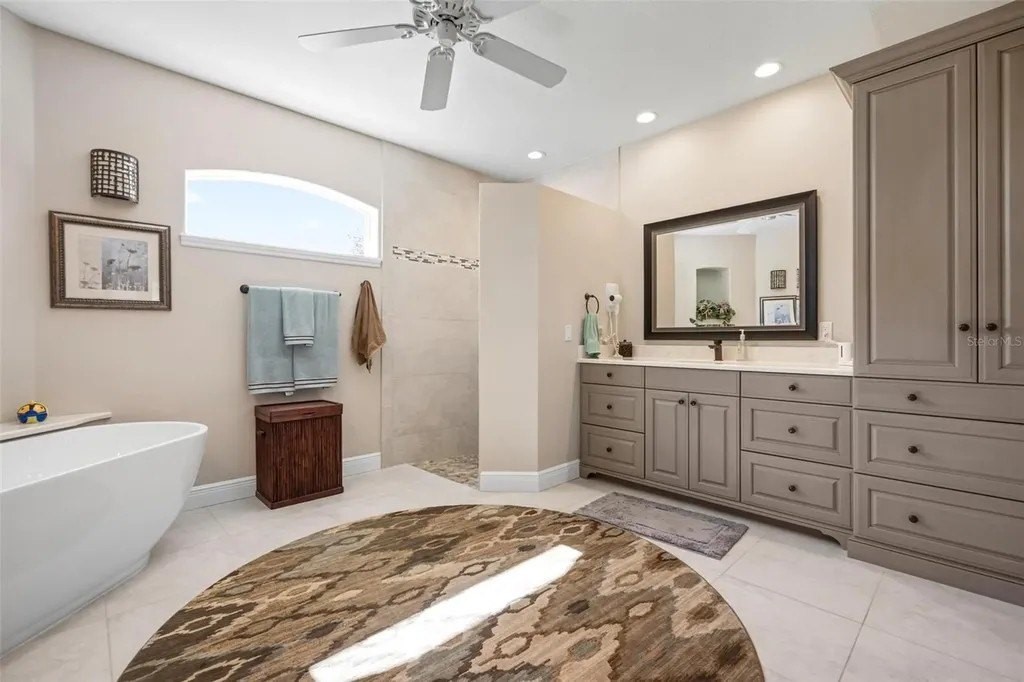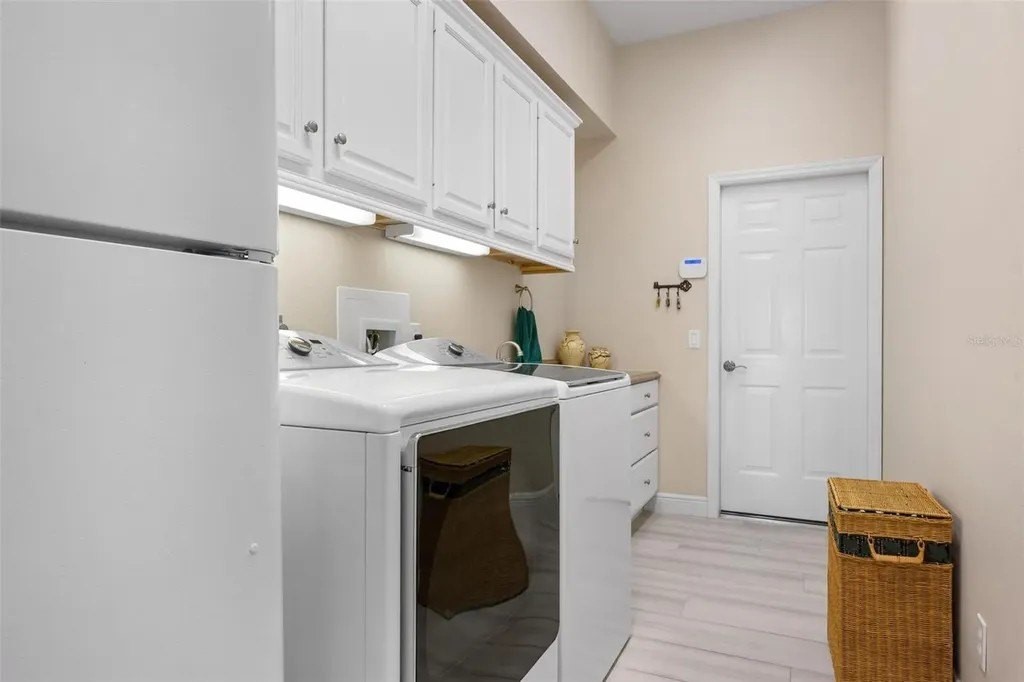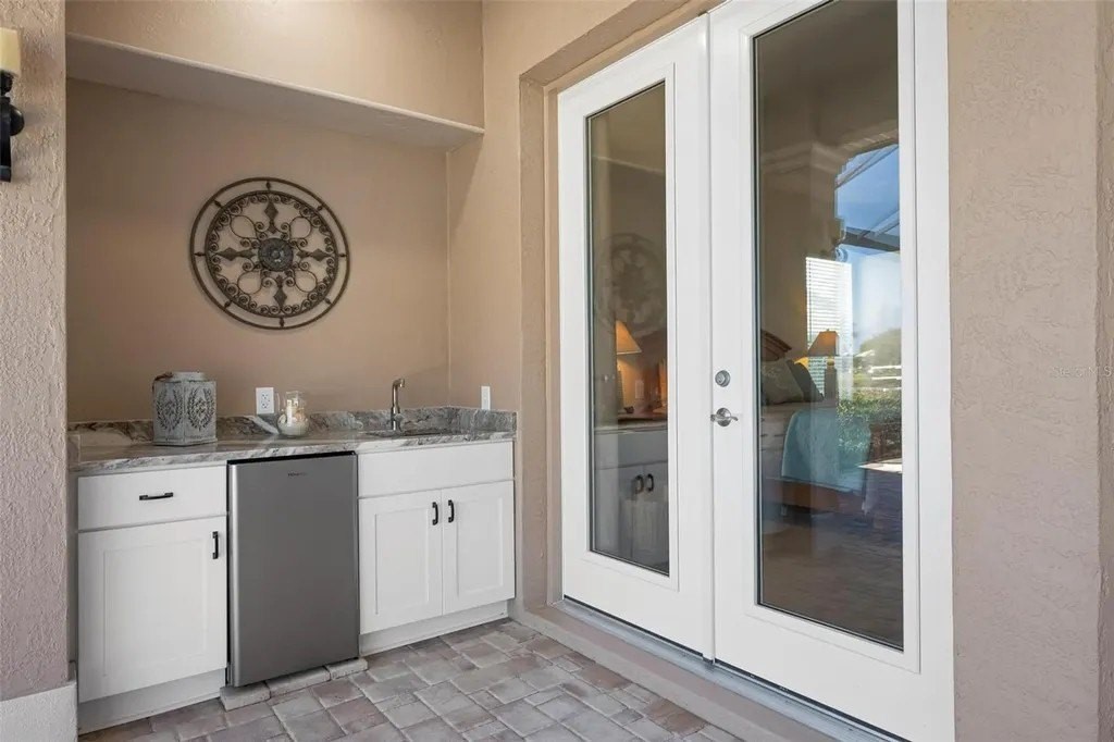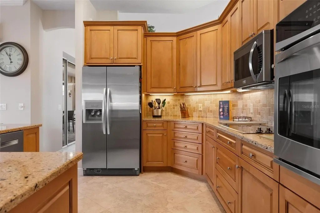Welcome home to The Reserve at The Plantation, a premier gated enclave where pride of ownership, timeless elegance, and resort-style living come together. This visibly striking residence offers exceptional curb appeal and has been meticulously cared for and thoughtfully updated throughout. Situated on a choice quarter-plus-acre lot, the home enjoys panoramic golf and lake views overlooking the Panther 7th and 8th fairways, all tucked away on a quiet, dead-end street-perfect for morning strolls with neighbors and furry friends alike. Designed with a desirable split-bedroom floor plan, the home features three spacious bedrooms and three baths, each offering generous closet space. The primary suite is a true retreat, complete with walk-in closets and a beautifully updated spa-inspired bath featuring custom cabinetry, quartz countertops, a spacious walk-in shower, and a luxurious soaking tub. Entertain with ease in the formal living and dining rooms, highlighted by crown molding, stylish plank tile flooring and pocketing sliding glass doors that open seamlessly to the expansive lanai. Outside, a stunning heated pool and spa are framed by a clear-view screen cage, offering breathtaking, unobstructed vistas of rolling fairways, tranquil lakes, and Florida's abundant wildlife. The updated kitchen and family room truly form the heart of the home. Custom BROOKHAVEN cabinetry, quartz countertops, walls of storage, a pantry, and a dry bar with wine refrigerator and glass-front cabinets create both beauty and function. Walls of glass provide front-row seats to sweeping golf and water views, making everyday living feel extraordinary. A private office with closet, finished with plank tile and peaceful views, offers flexible space for work or guests. The spacious laundry room is equally impressive, featuring wall cabinetry, a laundry tub, washer and dryer, and a full-size second refrigerator. The tropical landscaped yard and long winding driveway lead to an oversized, side-load two-car garage with room for golf cart parking, epoxy flooring, abundant storage, and attic access-immaculate and thoughtfully designed. Located within The Plantation Golf and Country Club, golf and social memberships are available but not mandatory, allowing you to enjoy the lifestyle at your own pace. Best of all, there are no CDD fees. Centrally positioned just 15 minutes from pristine Gulf beaches, historic Downtown Venice, the Legacy Trail, Downtown Wellen Park, and a wide array of shopping and dining, this home delivers the perfect balance of tranquility and convenience. A truly fabulous home in an exceptional location-where pride of ownership shines throughout. A full list of upgrades is available.